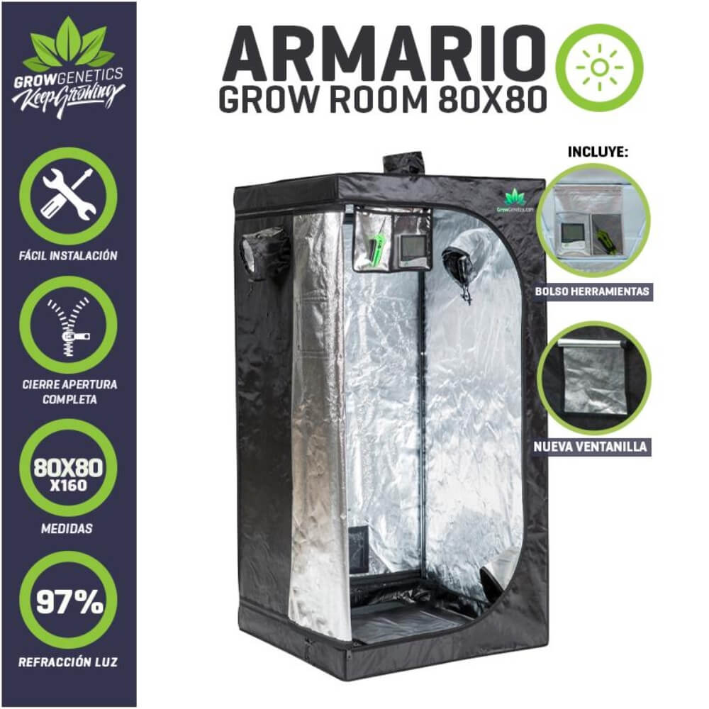 Los armarios de Grow Genetics permiten tener un ambiente controlado del cultivo con el fin de optimizar todas las variables como agua, fertilizantes, intensidad de la luz, temperatura, humedad, entre otras. Una de las últimas mejoras introducidas por Grow Genetics fue la incorporación de un bolsillo para guardar tus herramientas de cultivo, pensado en dejar el termohigrómetro, tijeras, lentes, microscopios o lo que tu quieras.