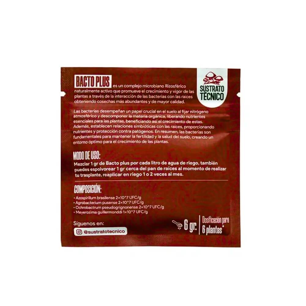 - Mezcla en Riego: Disolver 1 gramo de Bacto Plus por cada litro de agua de riego.