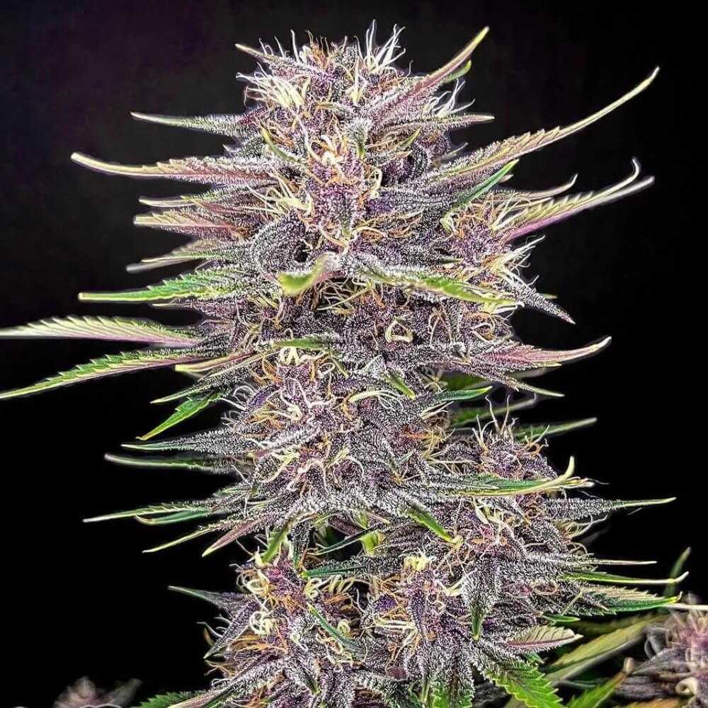 Debido a la herencia Indica, esta planta tiene un corto espacio internodal que da la impresión de que en cada rama individual está creciendo un enorme cogollo. Las hermosas flores de color lila oscuro contrastan perfectamente con las hojas de abanico anchas que se desvanecen en un hermoso tono verde claro al final de la floración.